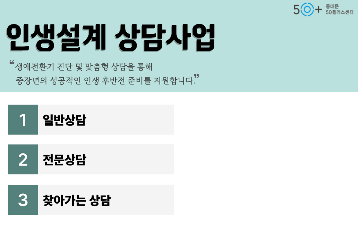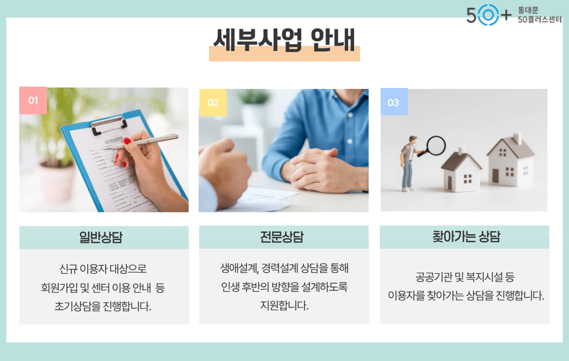 동대문50플러스센터 서울특별시 동대문구 외대역동로5길 18 사업자등록번호 : 174-82-81708