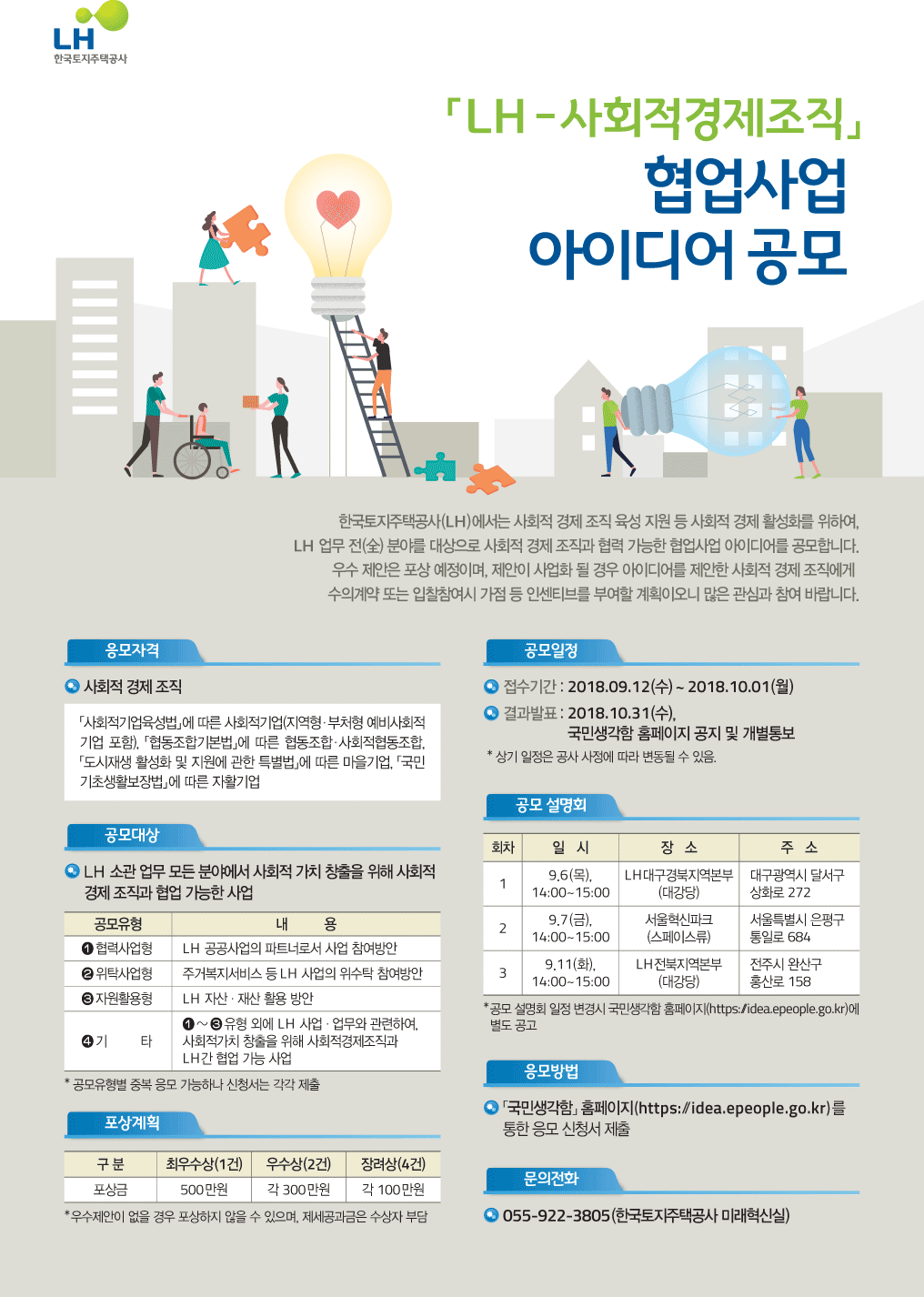 한국토지주택공사(LH)는 10월 1일(월)까지 LH의 소관 사업 전 분야를 대상으로 사회적경제 조직과 협업할 수 있는 사업 아이디어를 공모합니다.