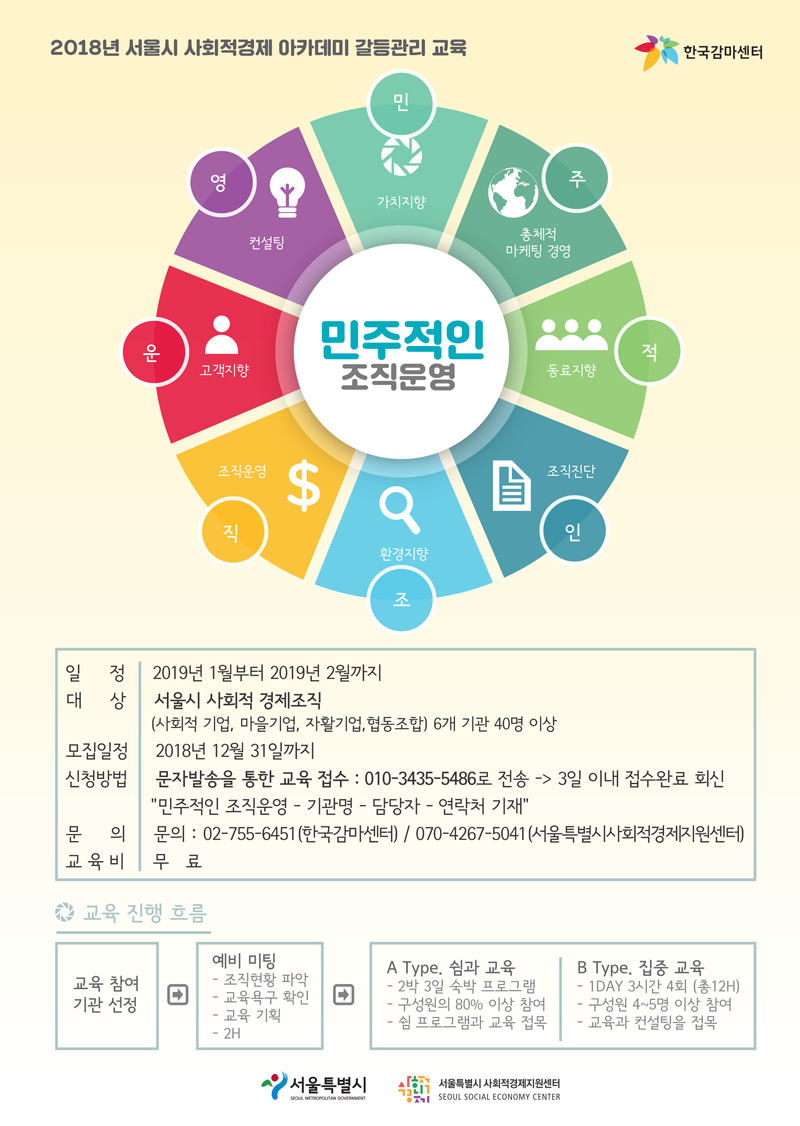 서울특별시 사회적경제지원센터와 한국감마센터는 12월 31일(월)까지 사회적경제 조직의 민주적 조직 운영을 위한 갈등관리 교육 참여 기관을 모집합니다.