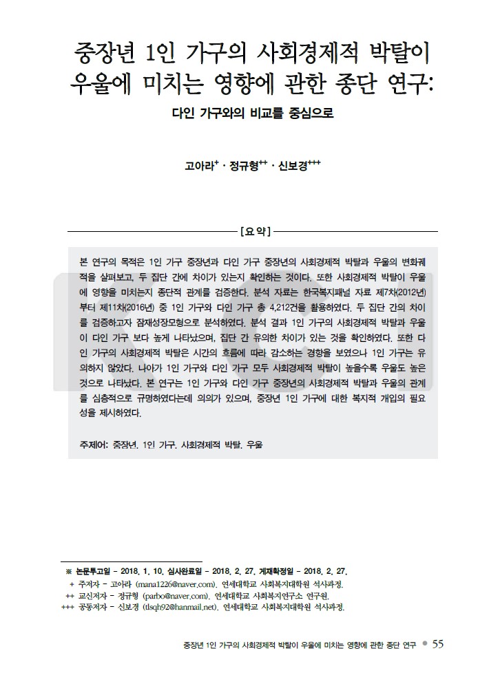• 1인 가구와 다인 가구 중장년의 사회경제적 박탈과 우울의 관계를 심층적으로 규명했으며, 중장년 1인 가구에 대한 복지적 개입을 제안함.