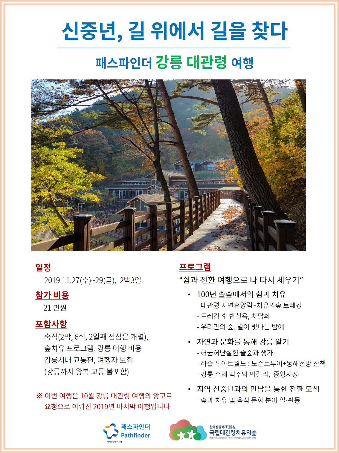 50+와 지역을 연결하는 예비관광벤처기업 <패스파인더 Pathfinder >가 국립대관령치유의숲과 함께 다시 한번 '강릉 대관령 여행'을 준비하였습니다. 10월 강릉 대관령 여행의 앙코르 요청으로 이뤄진 2019년 마지막 여행입니다.