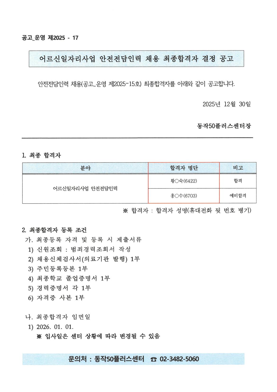 서울시 동작센터 | 2026년 어르신일자리사업 안전전담인력 채용 최종합격자 공고