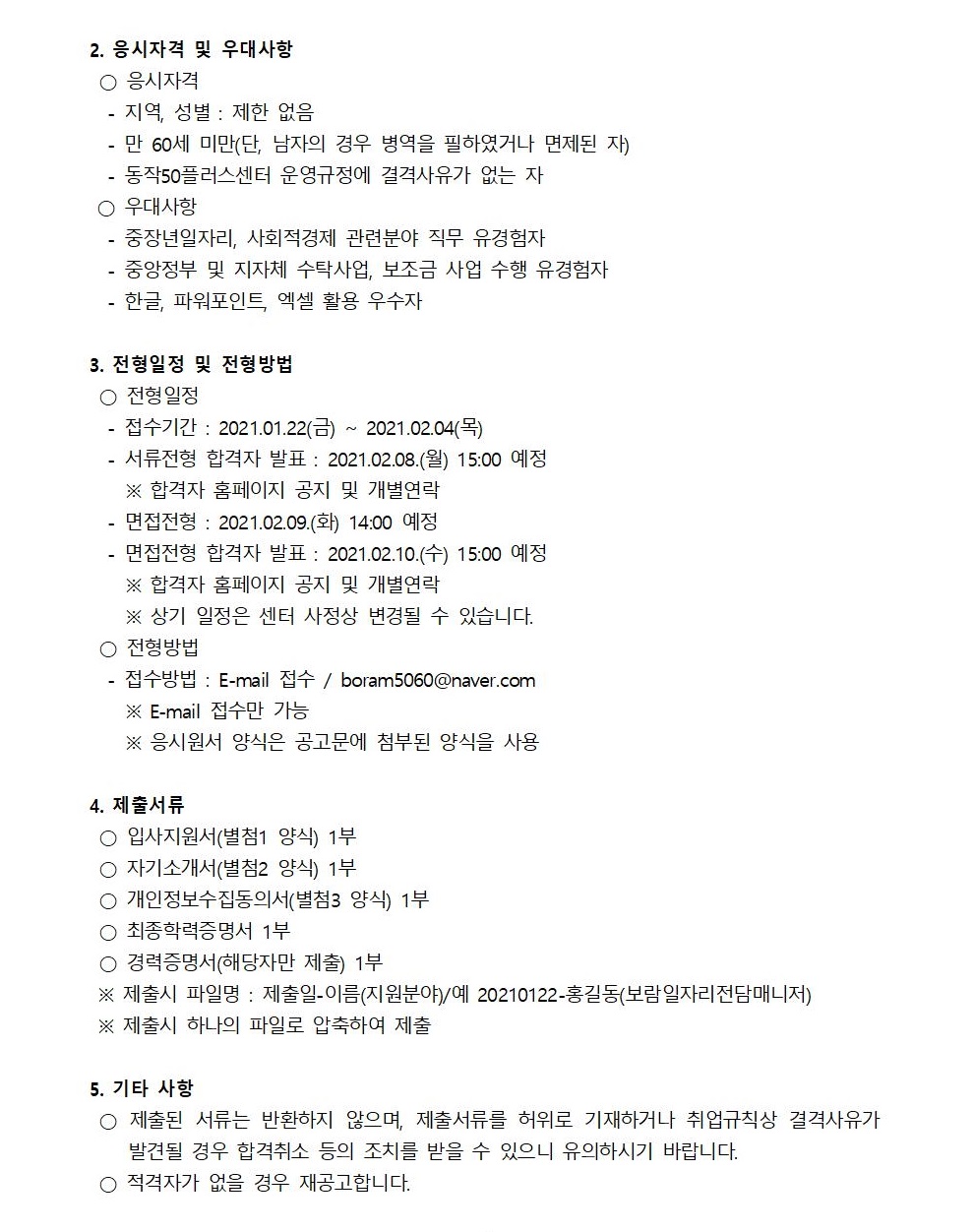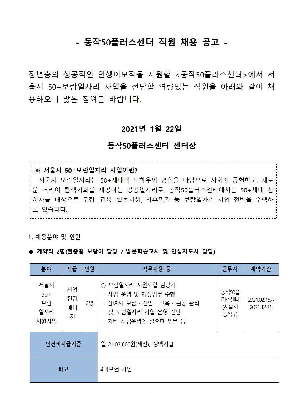 2021년 서울시보람일자리사업 매니저 채용 공고