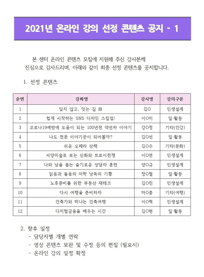 2021년 온라인 콘텐츠 및 강사모집 선정결과 공지