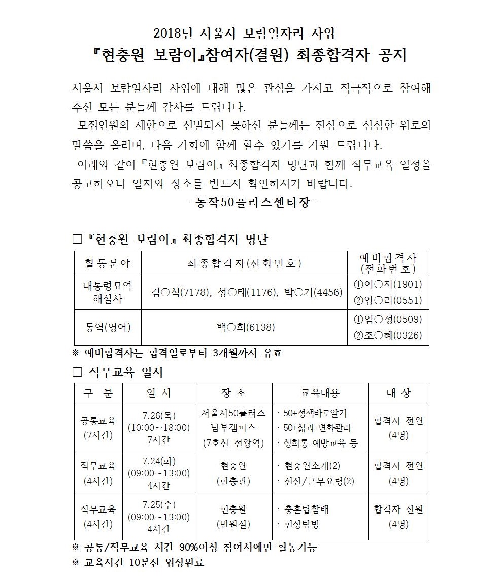 2018 보람일자리사업 '현충원보람이'참여자 최종합격자 공고