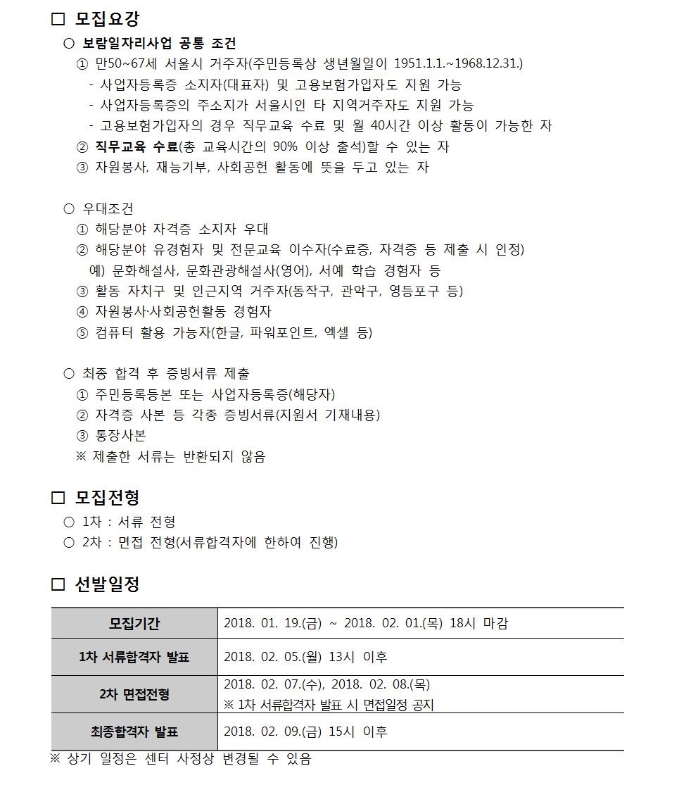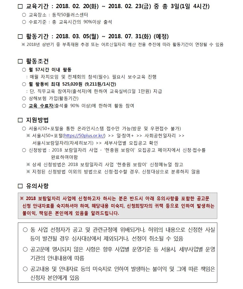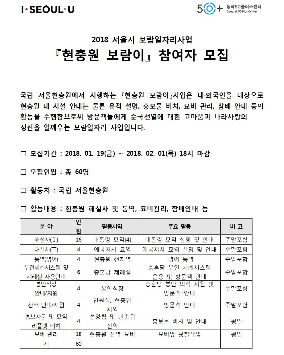 2018년 보람일자리사업 '현충원 보람이' 참여자 모집 공고