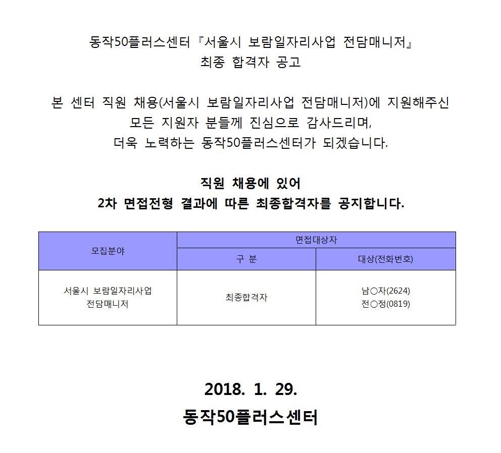 2018년 서울시 보람일자리사업 전담매니저 최종합격자 공지