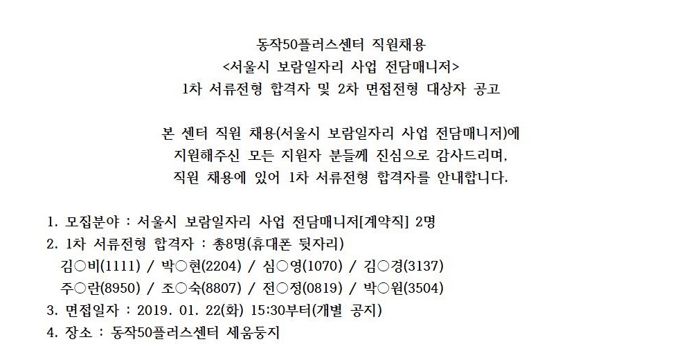 2019 보람일자리 사업 전담매니저 1차 서류전형 합격자 및 면접전형 대상자 공고