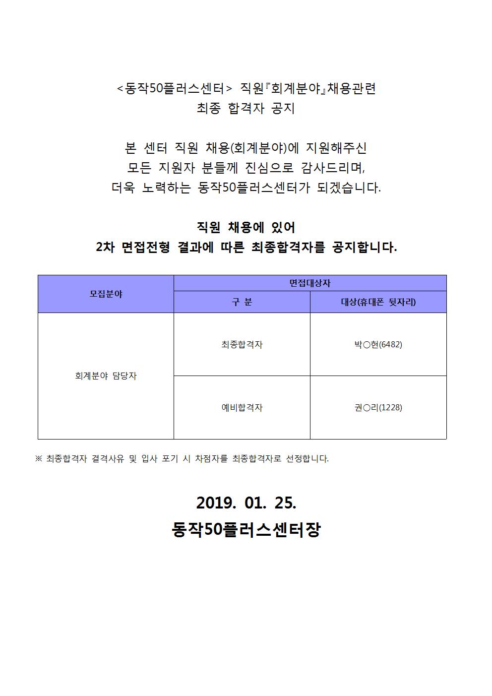 <동작50플러스센터>직원(회계분야)채용관련 최종 합격자 공지