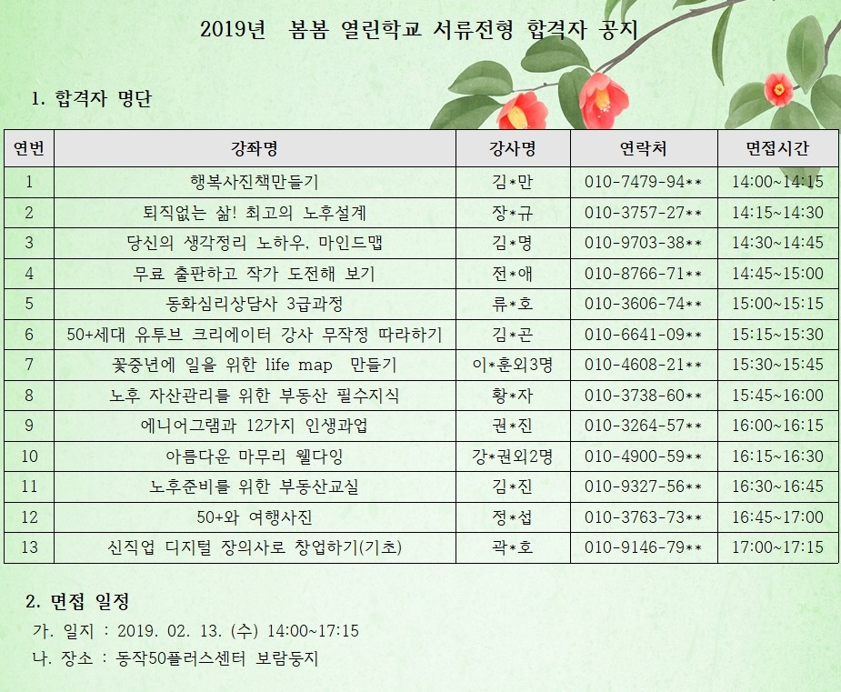 2019년 봄봄 열린학교 서류전형 합격자 공지