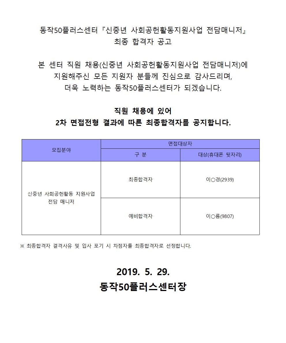 2019 신중년 사회공헌활동 지원사업 전담매니저 최종 합격자 공고