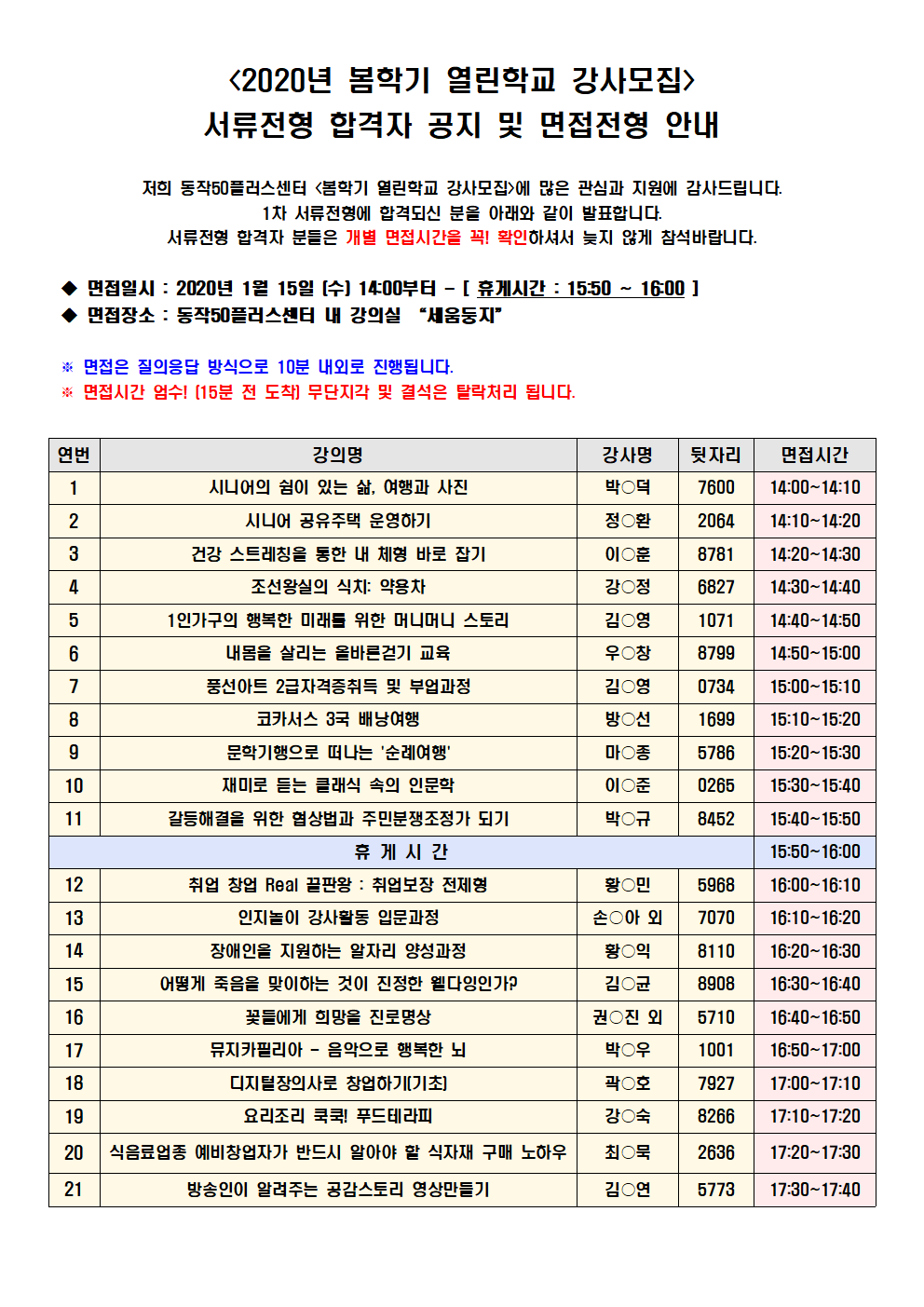 <2020년 봄학기 열린학교 강사모집> 서류전형 합격자 공지 및 면접전형 안내