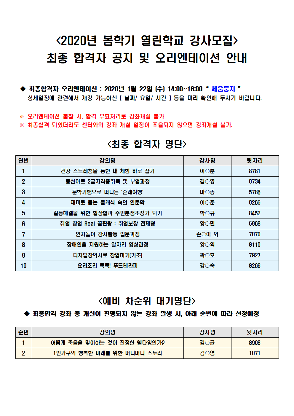 <2020년 봄학기 열린학교 강사모집> 최종 합격자 공지 및 오리엔테이션 안내