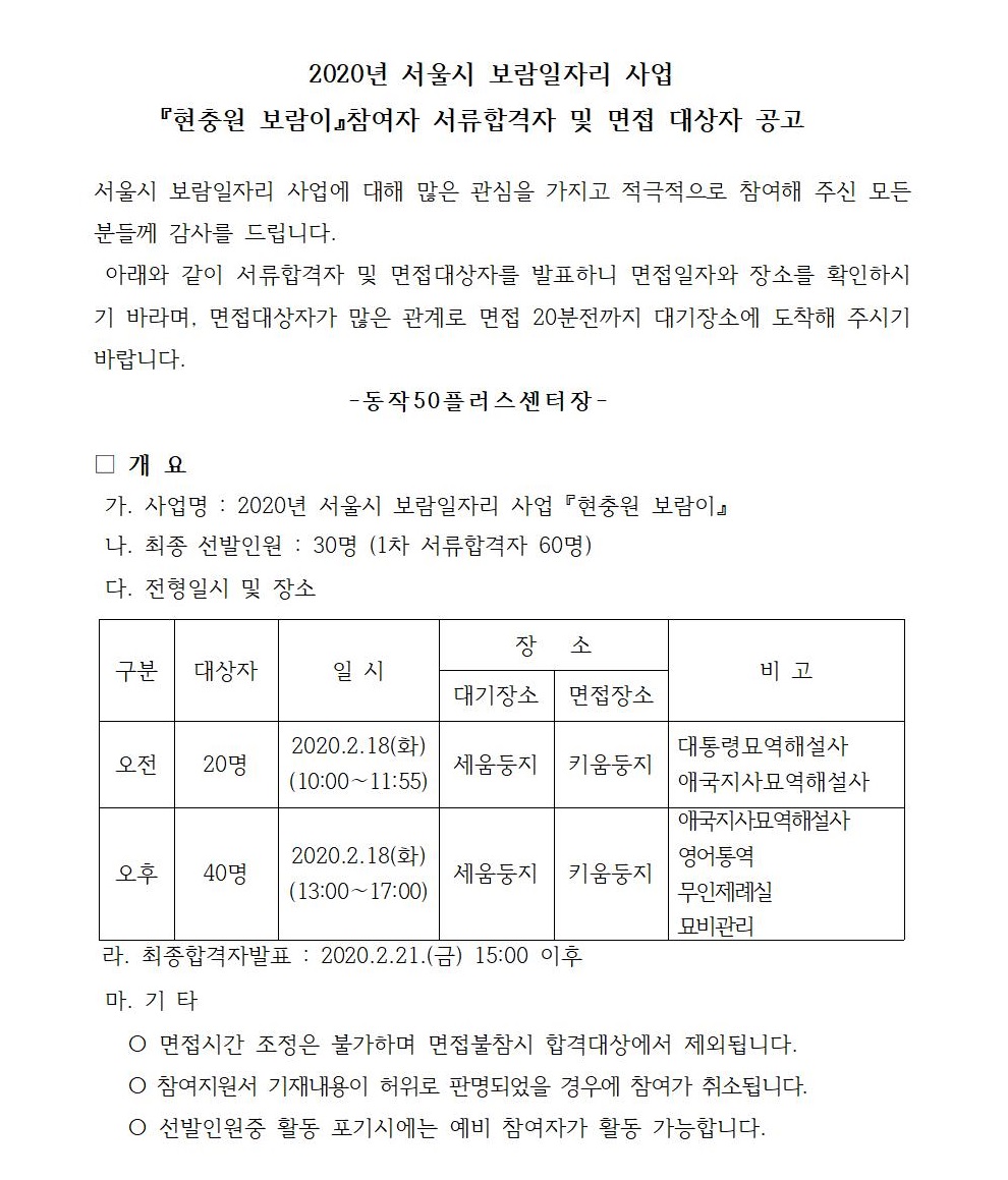 2020 보람일자리사업 '현충원 보람이' 서류전형 합격자 발표 및 면접일정 공지