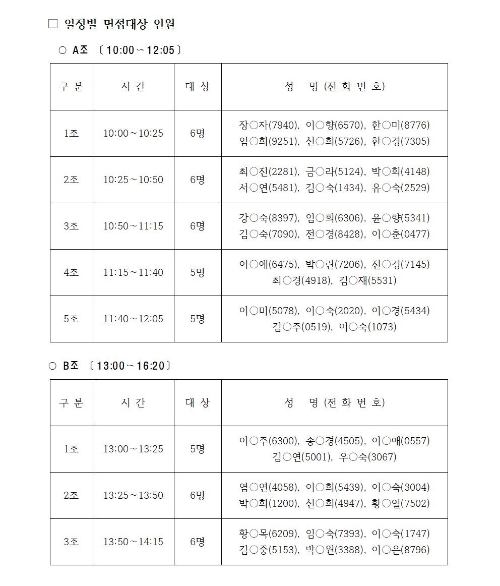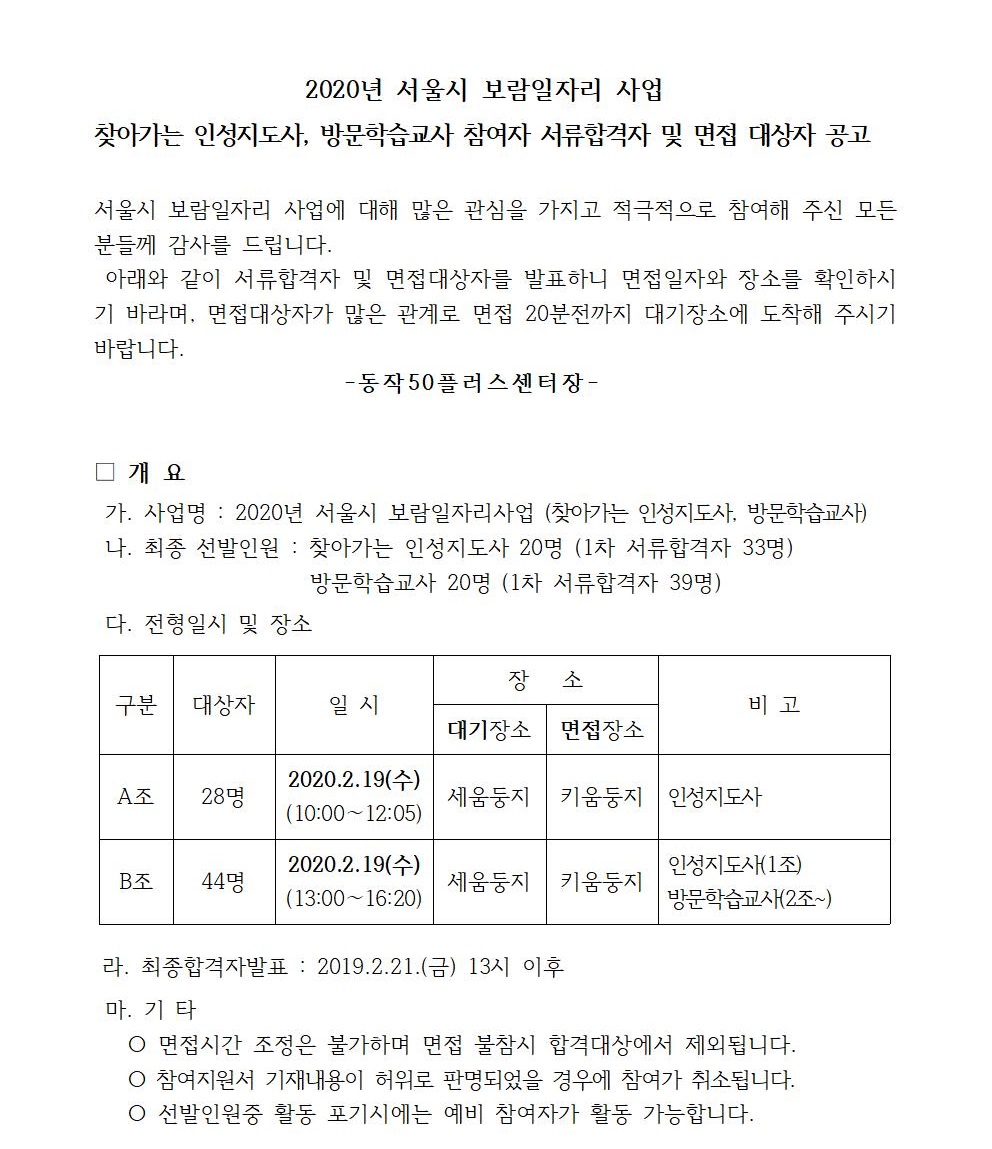 2020 보람일자리사업 '방문학습교사''찾아가는 인성지도사' 서류전형 합격자 발표 및 면접일정 공지