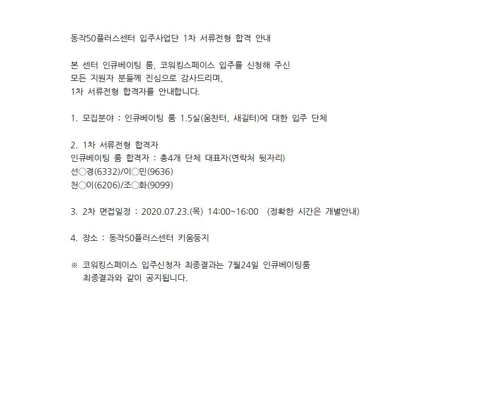 2020년 상반기 입주사업단 1차 서류전형 합격 안내
