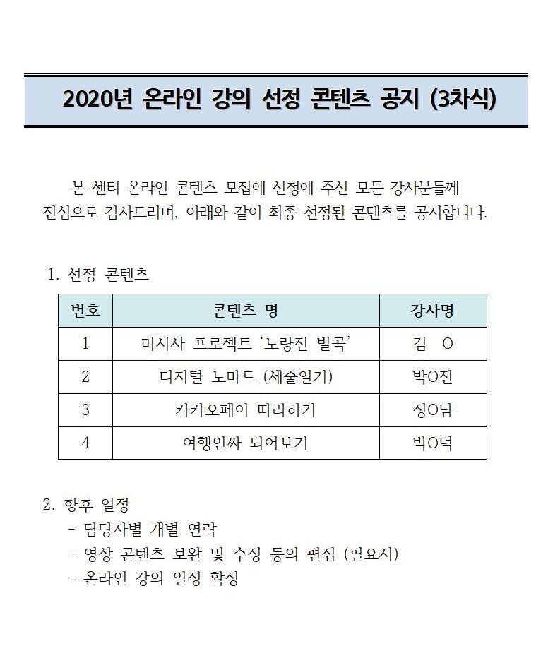 2020년 온라인 강의 최종 선정 콘텐츠 발표 공지 (3차)