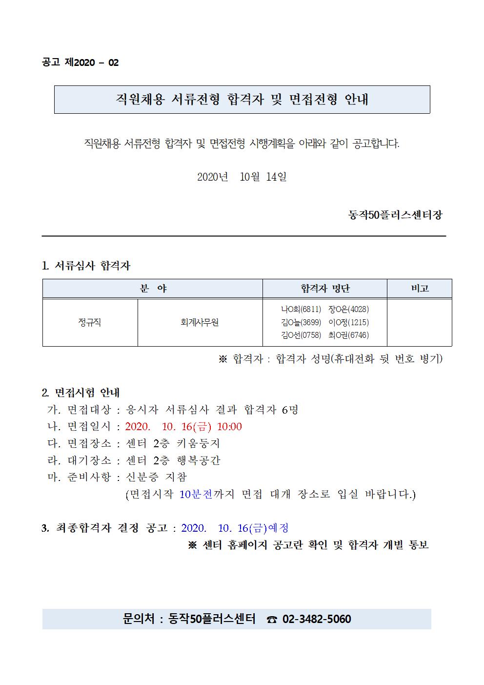 직원채용 서류전형 합격자 및 면접전형 안내[회계사무원]
