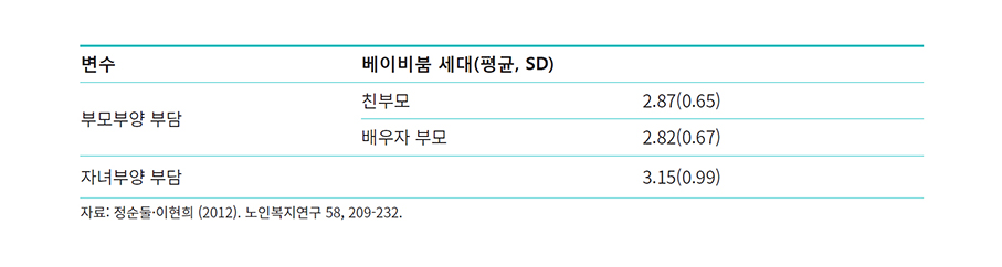 다음으로 베이비부머의 자녀 양육에 대한 부담을 부모 부양과 비교한 결과 부모 부양에 비해 자녀양육에 대한 부담이 더 큰 것으로 나타났다(정순둘·이현희, 2012). 이는 베이비붐 세대의 자녀들 대부분이 아직 학생이라서 자녀들에 대한 교육비 지출이 많기 때문으로 해석된다. 그러나 베이비부머의 경우 자신의 노후에 관해서는 후(後)세대가 책임져 주어야 한다는 기대를 갖고 있지 않은 것으로 나타났다(정경희, 2011).