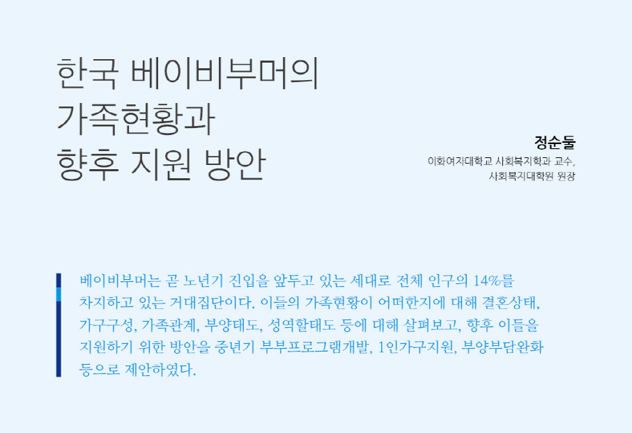 베이비부머는 곧 노년기 진입을 앞두고 있는 세대로 전체 인구의 14%를 차지하고 있는 거대집단이다이들의 가족현황이 어떠한지에 대해 결혼상태가구구성가족관계부양태도성역할태도 등에 대해 살펴보고향후 이들을 지원하기 위한 방안을 중년기 부부프로그램개발, 1인가구지원부양부담완화 등으로 제안하였다.
