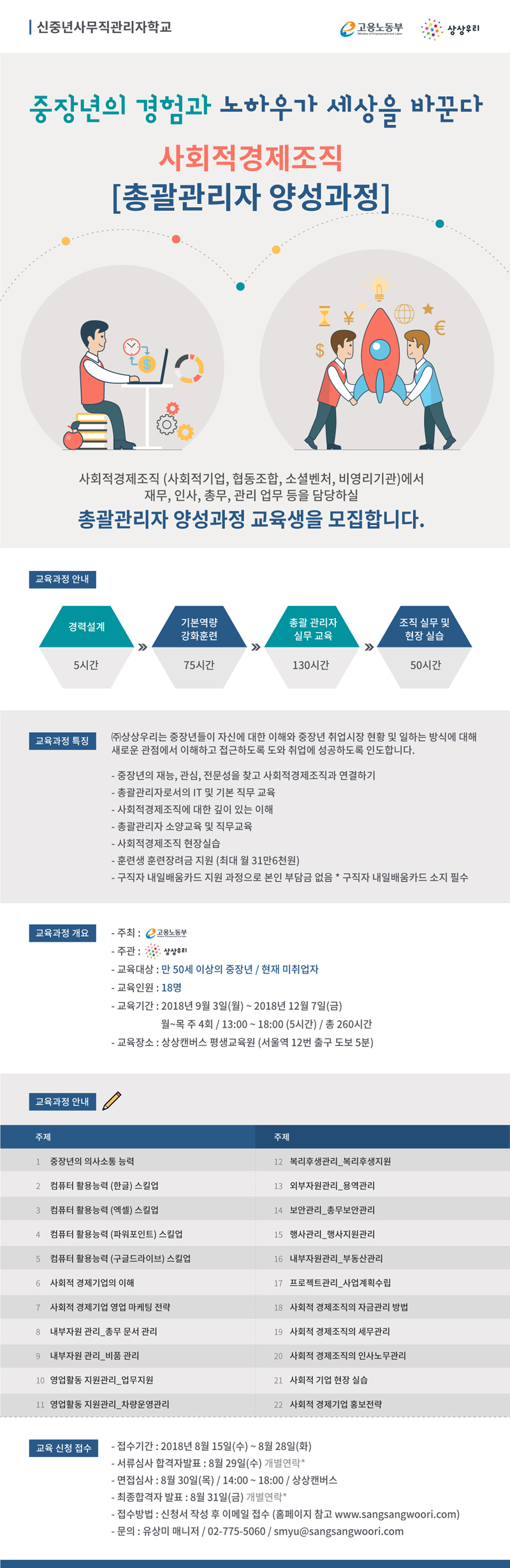 중장년층이 자신의 경험과 능력으로 사회적경제 영역에서 새로운 커리어를 쌓도록 돕는 사회적기업 (주)상상우리에서 8월 28일(화)까지 사회적경제조직 총괄관리자 양성과정 교육생을 모집합니다.