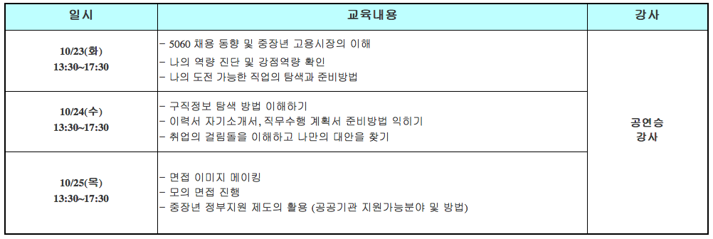 교육은 5060 채용 동향 및 중장년 고용시장의 이해, 역량 진단, 구직정보 탐색법, 이력서·자기소개서·직무수행계획서 준비법, 모의 면접 등의 프로그램으로 진행됩니다.