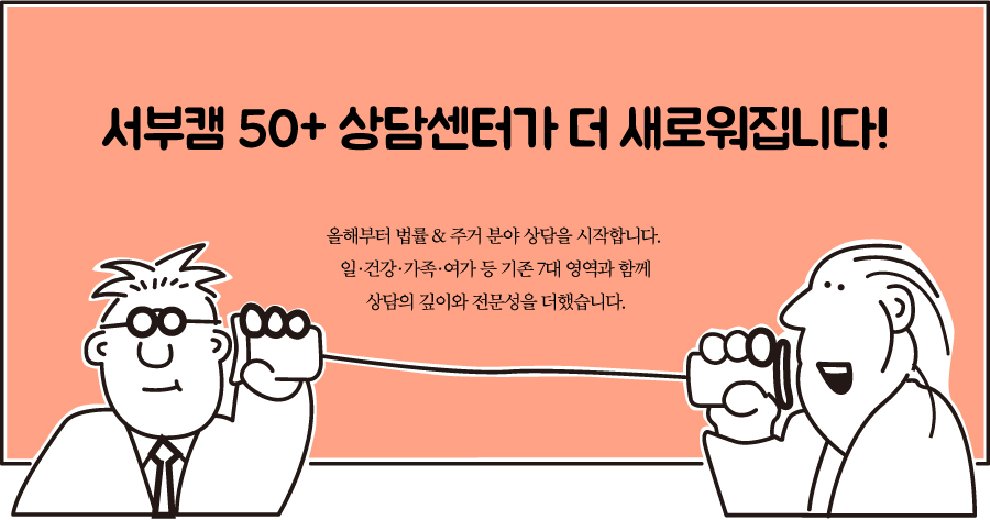 "50+세대만을 위한 전문 상담을 원하시나요? 서부캠퍼스 1층으로 오세요!"