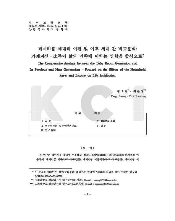 • 한국노동패널(KLIPS) 17차년도(2014) 원자료를 이용해 베이비붐 세대(1955~1963년생), 베이비붐 이전 세대(1941~1954년생), 베이비붐 이후 세대(1964~1974년생)의 가계자산 및 소득이 삶의 만족에 미치는 영향을 분석한 연구.