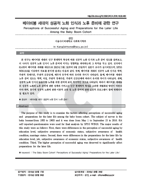 • 이 연구는 베이비붐 세대의 인구 통계학적 특성에 따른 성공적 노화 인식과 노후 준비 정도를 살펴보고, 성공적 노화 인식이 노후 준비에 미치는 영향력을 파악함.