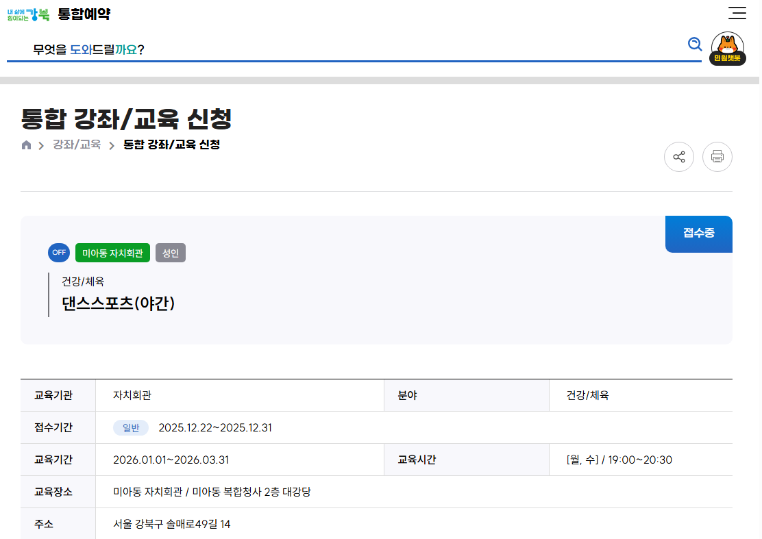 교육장소 : 미아동 자치회관(서울 강북구 솔매로49길 14) / 미아동 복합청사 2층 대강당