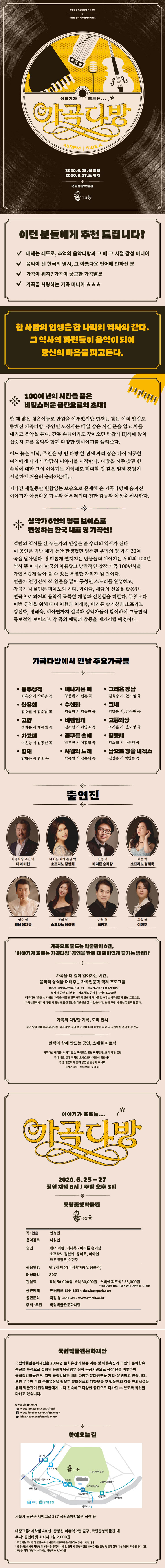가곡이라는 장르가 익숙하지 않은 이들도 쉽고 재미있게 가곡의 매력을 발견할 수 있도록 스토리와 음악이 함께 어우러져 완성하는 가곡 음악극 <가곡다방>으로 초대합니다.