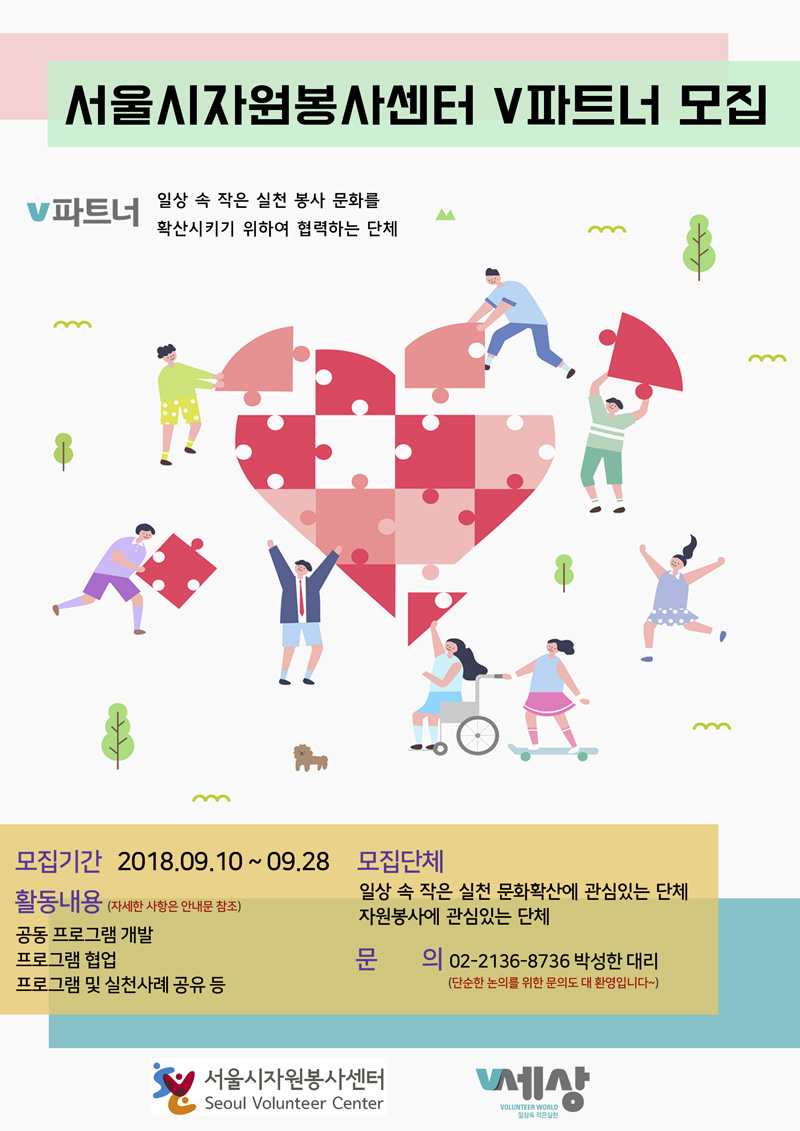 서울시자원봉사센터는 9월 28일(금)까지 일상 속 작은 실천을 주제로 센터와 협업할 V파트너 단체를 모집합니다.