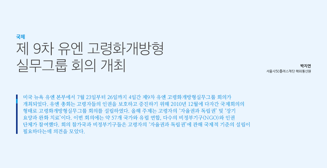 ▶ 제 9차 유엔 고령화개방형실무그룹 회의(The United Nations General Assembly Open-ended Working Group on Ageing)가 미국 뉴욕 유엔 본부에서 723일부터 26일까지 4일간 개최되었다. 유엔 총회는 고령자들의 인권을 보호하고 증진하기 위해 201012월에 다자간 국제회의의 형태로 고령화개방형실무그룹 회의를 설립하였다. 그 후 매년 뉴욕에서 개최되는 해당 회의에는 유엔 회원국, 인권 단체, 국제기구, 시민단체 등이 참여하여 국제 협약 체결을 논의하고, 고령자 권익 증진을 위한 제도 개선방안을 모색한다.