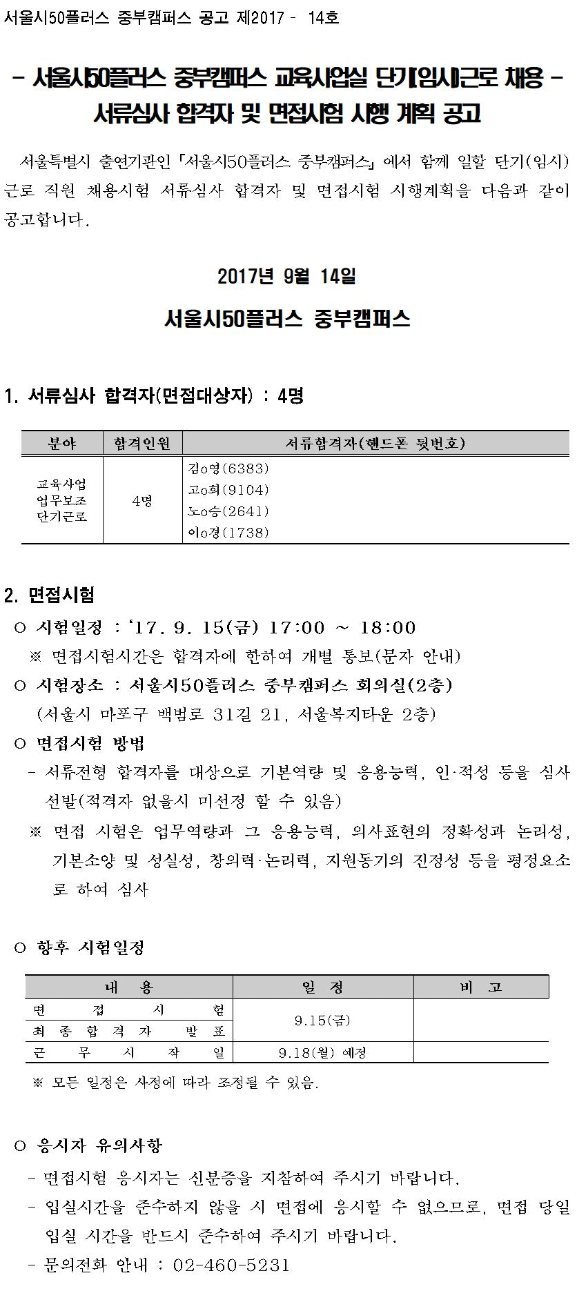 [재단][중부] 교육사업실 단기(임시)근로 서류심사 합격자 및 면접시험 공고