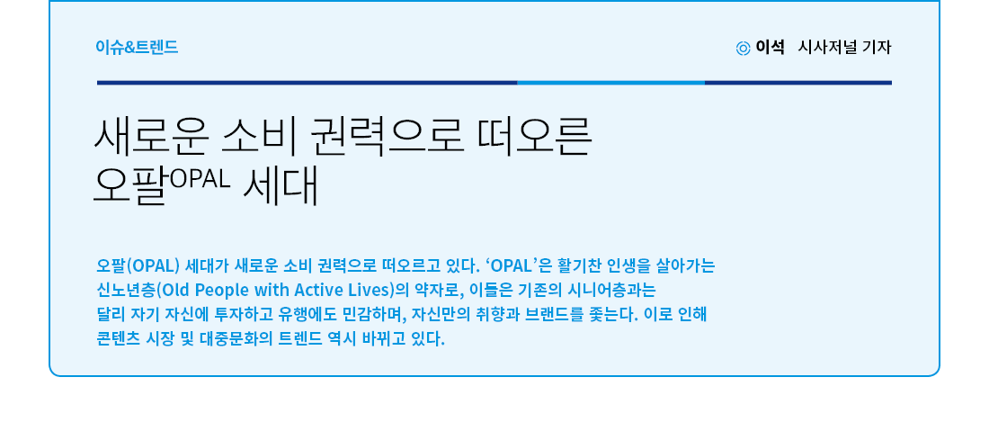 지난해 김난도 서울대 교수가 ‘올해 10대 소비 키워드’ 중 하나로 ‘오팔(OPAL) 세대’를 지목하면서 이 베이비붐 세대가 주목받고 있다. 유행에 민감하기 때문에 젊은 층과 마찬가지로 자신만의 취향과 브랜드를 좇으며 새로운 소비 권력으로 떠오르고 있는 것이다. 여기서 ‘OPAL’은 활기찬 인생을 살아가는 신노년층(Old People with Active Lives)의 약자로, 베이비부머를 대표하는 58년 개띠를 의미한다.