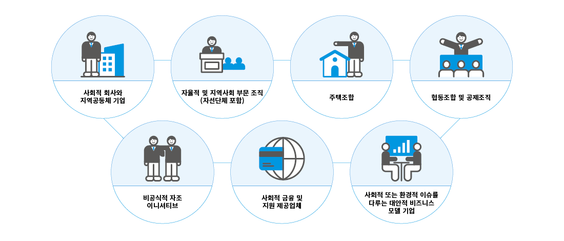 영국의 사회적 경제에 대한 개념은 상호주의와 연대를 통해 사람들이 어떻게 관계를 맺고, 또 어떤 협력을 통해 사람들의 요구를 충족시키는가에 대한 원칙에 기반을 둔다. 또한 영국의 사회적 경제에 대한 개념은 삶의 질 향상을 위해 경제를 다르게 이해하거나 구조화하는 비즈니스 모델도 사회적 경제 영역에서 다루어진다. 영국의 사회적 기업에 대한 범주는 상당히 폭넓게 인식되는데, 이는 ‘명확한 사회적 목적’, ‘영업활동을 통한 이윤 확보’, ‘사회적 목적을 위한 이윤의 재투자’라는 공통점을 지닌 조직들을 포괄한다. 여기에는 법적인 다양한 사회적 기업이 존재하는데 사회적 기업으로 분류되는 조직들은 다음과 같다.