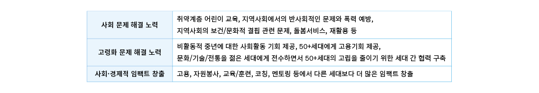 50+사회적 기업가들의 비즈니스 모델을 분석해 보면 공동체가 직면하고 있는 문제를 해결하는 방식으로 사회에 기여하고자 하는 것을 볼 수 있다. 특히, 50+당사자들의 문제이기도 한 고령화에 따른 사회 문제 해결, 지역사회의 소외된 계층에 대한 문제 해결, 경륜과 축적된 지식을 이용한 코칭, 멘토링 등을 통하여 사회에 기여를 하고 있다.
