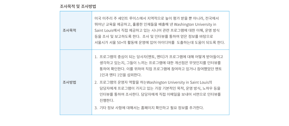 이 프로그램은 시니어의 인력을 활용하여 외국인 학생에게 도움을 줄 수 있는 활동으로 서로에게 도움을 주는 좋은 프로그램이라고 생각한다. 따라서 서울시 50+가 새로운 정책을 만드는 데 시사하는 점은 다음과 같다.