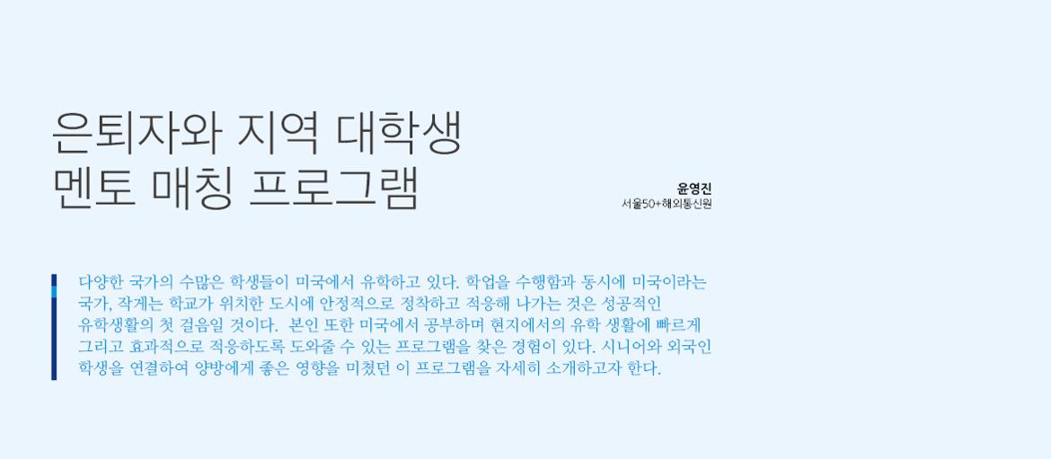 다양한 국가의 수많은 학생들이 미국에서 유학하고 있다. 학업을 수행함과 동시에 미국이라는 국가, 작게는 학교가 위치한 도시에 안정적으로 정착하고 적응해 나가는 것은 성공적인 유학생활의 첫 걸음일 것이다.  본인 또한 미국에서 공부하며 현지에서의 유학 생활에 빠르게 그리고 효과적으로 적응하도록 도와줄 수 있는 프로그램을 찾은 경험이 있다. 시니어와 외국인 학생을 연결하여 양방에게 좋은 영향을 미쳤던 이 프로그램을 자세히 소개하고자 한다.