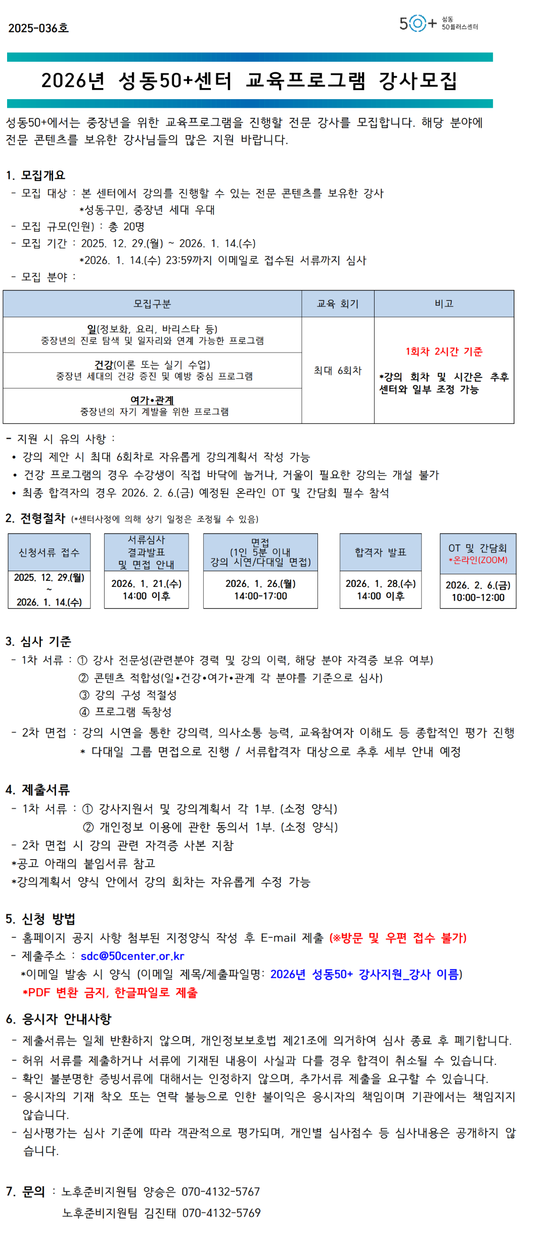 서울시 성동센터 | 2026년 성동50플러스센터 교육프로그램 강사모집 공고(~1/14)