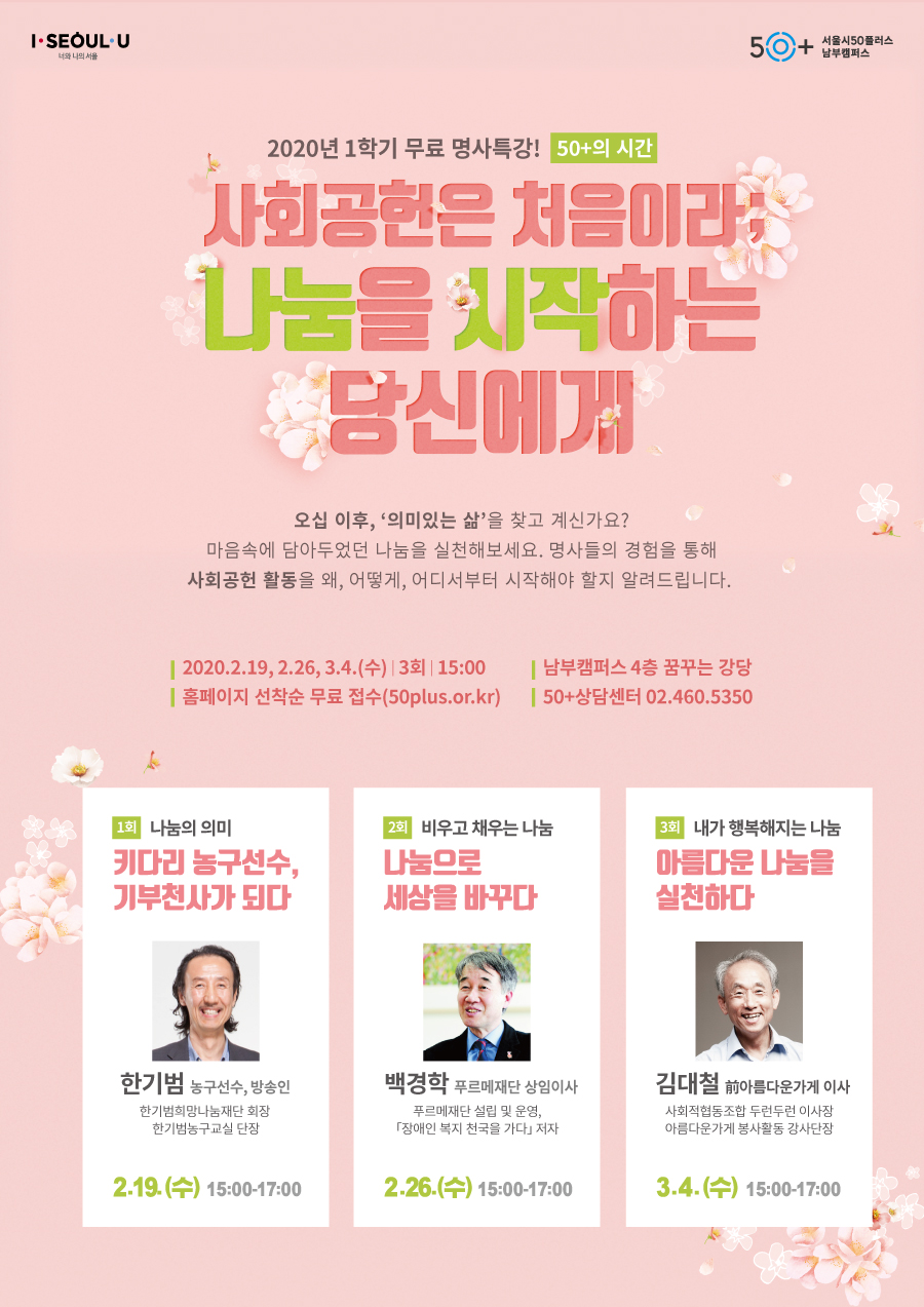 개최 예정이었던 무료명사특강 <50+의 시간> 이 신종 코로나바이러스 감염증 확산 예방을 위하여 서울시 정책에 따라 불가피하게 취소 되었습니다.